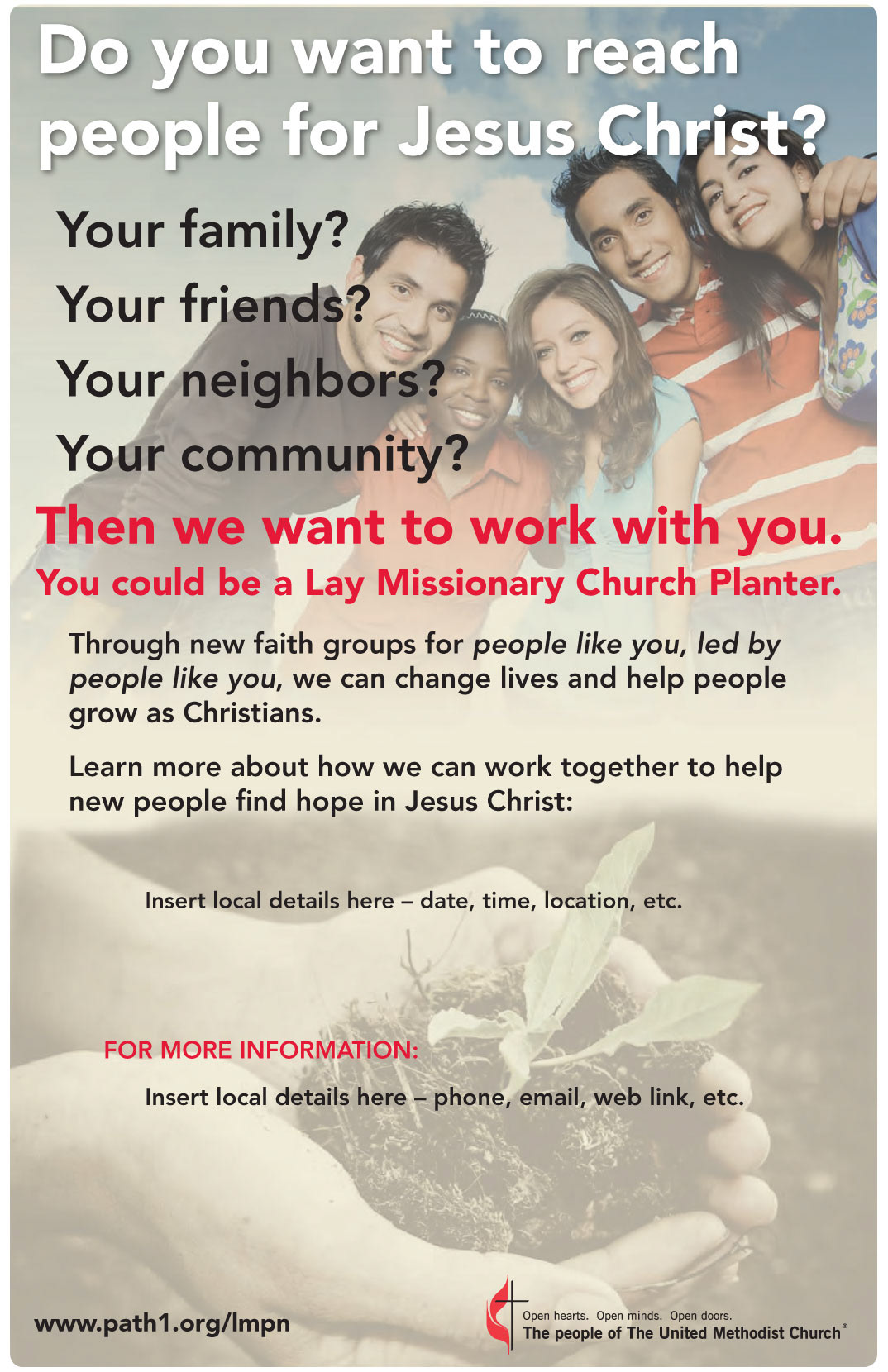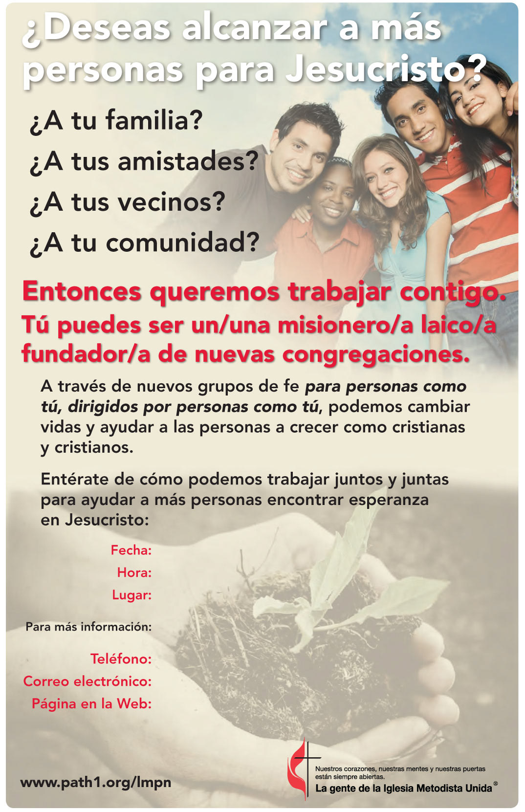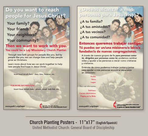United Methodist Church: General Board of Discipleship - Church member recruiting poster in English and Spanish